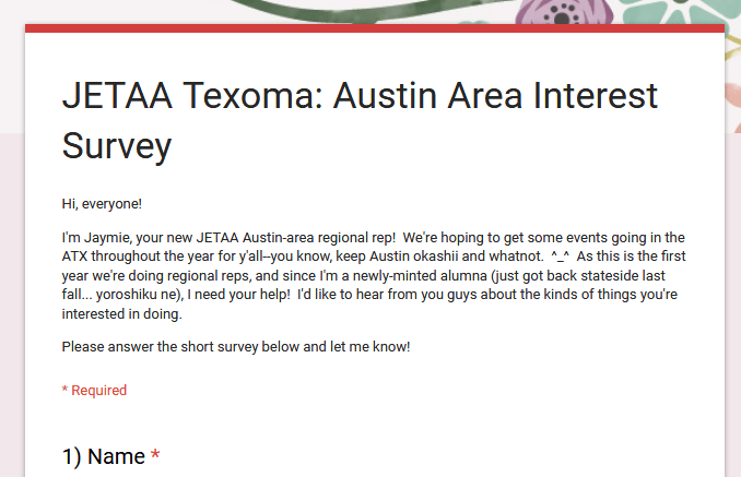 UPDATE: The deadline for this survey is June 16, 2017 Hi, Austin alumni! We're trying to expand our JETAA events in your area, and we want to hear from you. Please click the link below* to take this short survey (only seven questions) to let us know what you'd like to see happening! https://goo.gl/forms/cF1mzDSVy3kDNksL2 *Previously, … Continue reading Austin Alumni Interests Survey