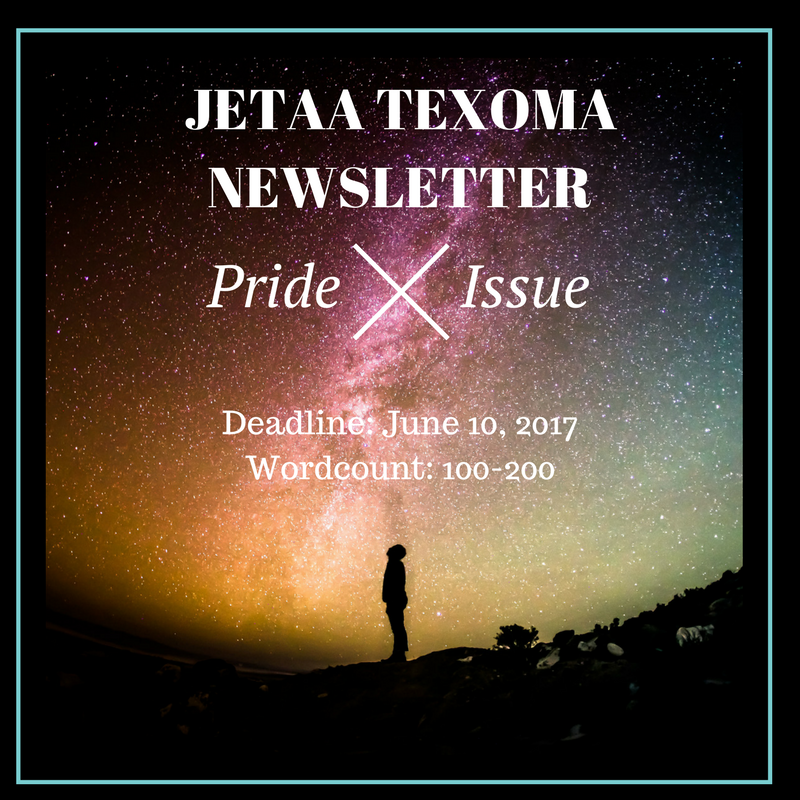 June is Pride month, and in celebration, your Press Officer will take entries for a mid-June Pride issue! To participate, please note the following details: Word count: 100-200 Deadline for submissions: June 10, 2017, 11:00 a.m. Theme: Pride-tastic story from your time in JET. This is a pretty free topic, but that's the point. Brainstorm and we're sure you'll find … Continue reading Newsletter: Pride 2017 Issue
